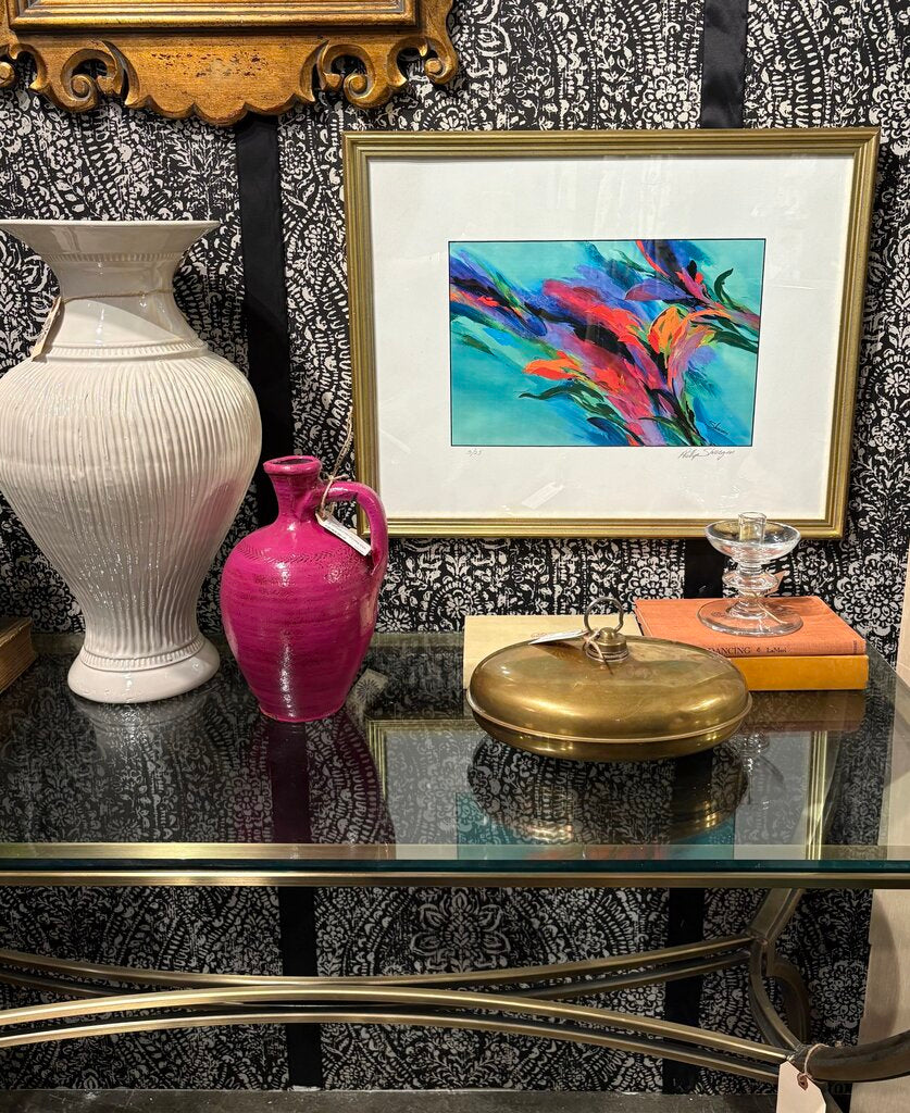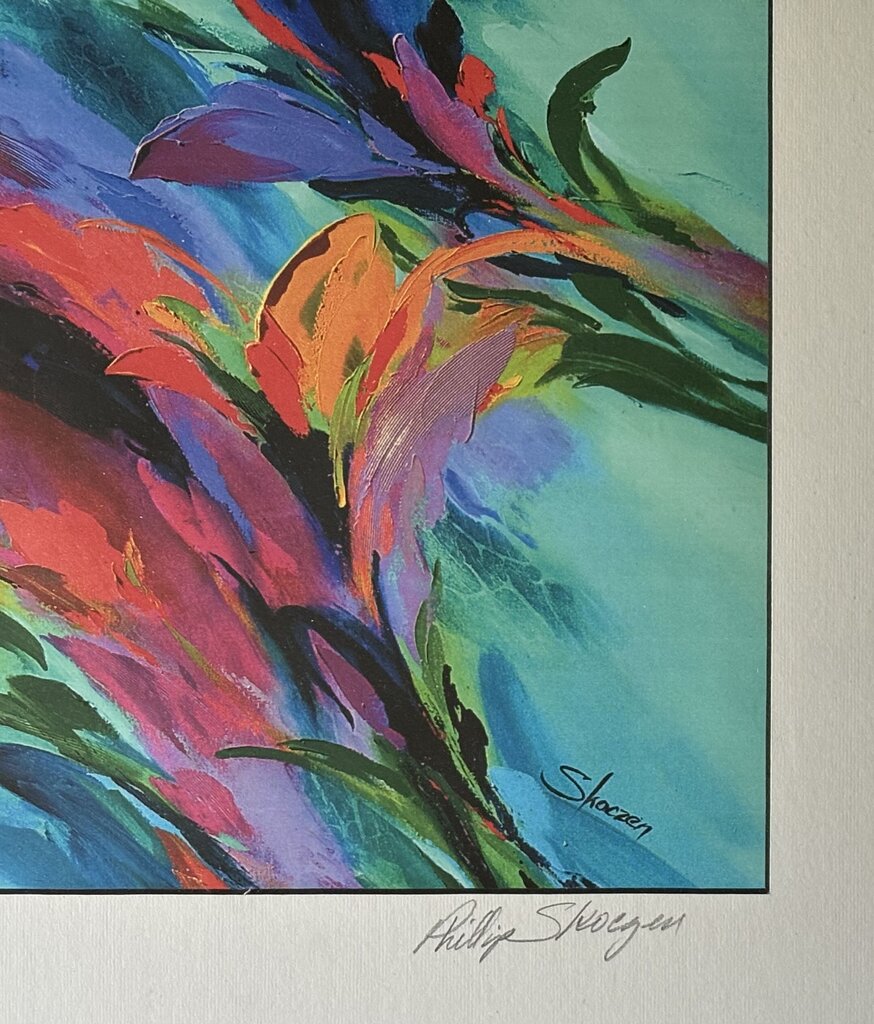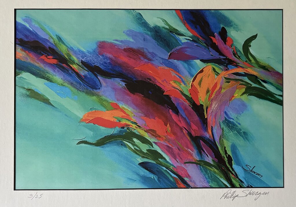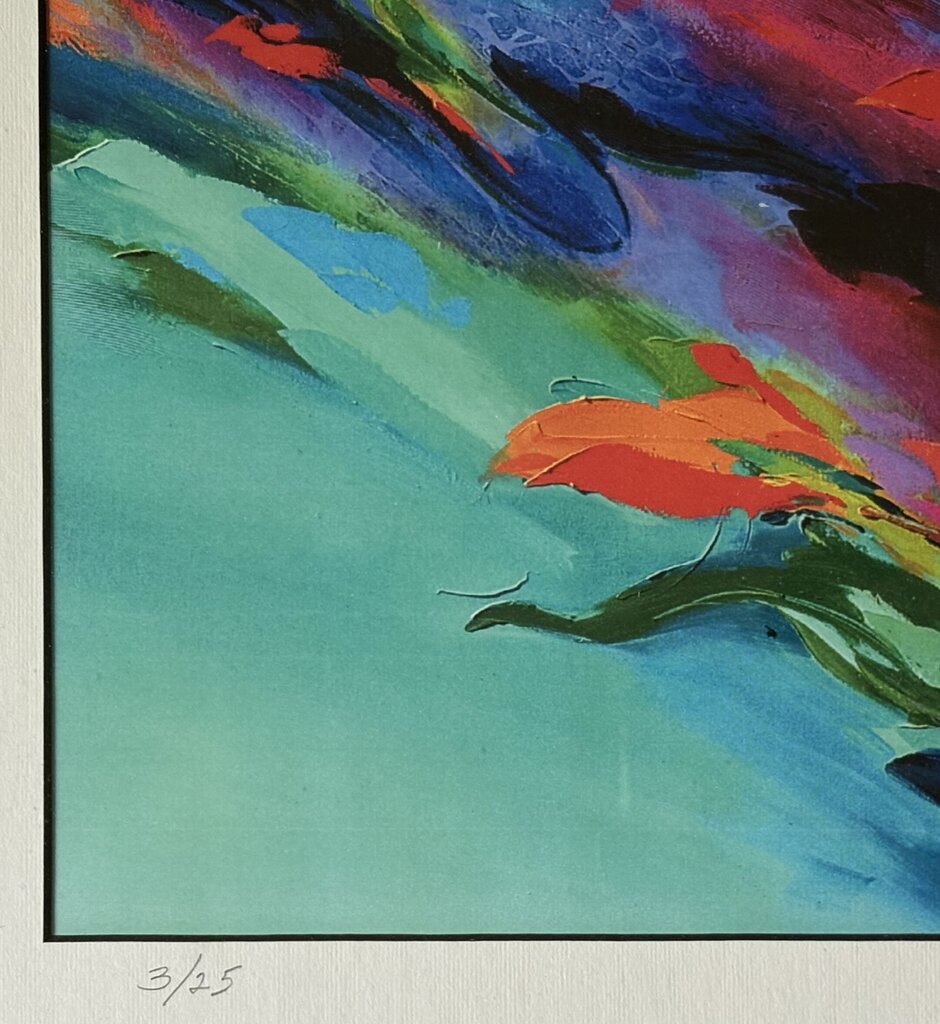 GORGEOUS VINTAGE ABSTRACT PAINTING ART PRINT BY ARTIST PHILLIP SKOCZEN. THE PRINT IS HAND SIGNED BY THE ARTIST AND NUMBERED 3/25. THE PRINT IS MATTED AND IN A GILDED FRAME.